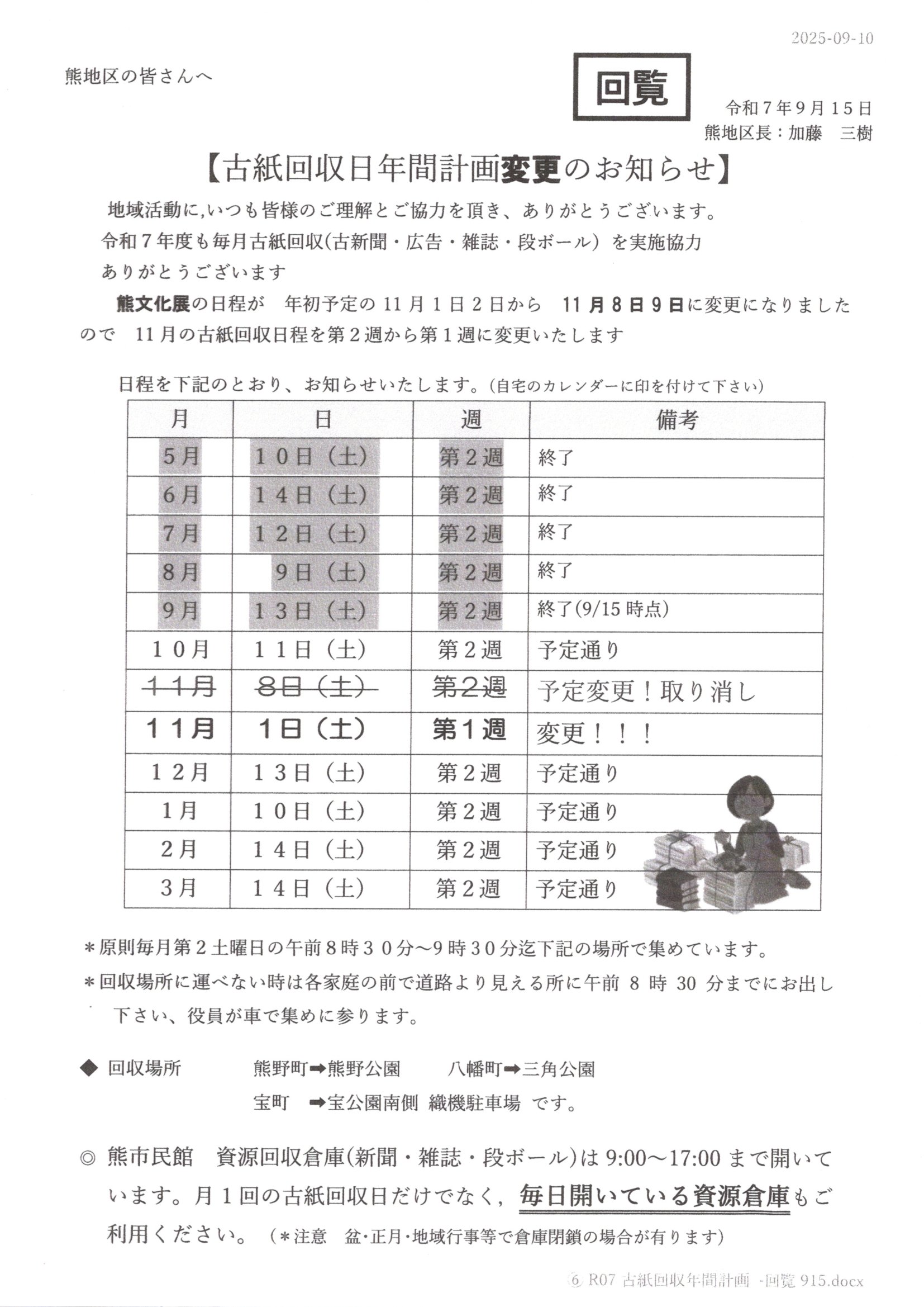 令和7年度 熊地区委員会 計画表・古紙回収日年間計画
