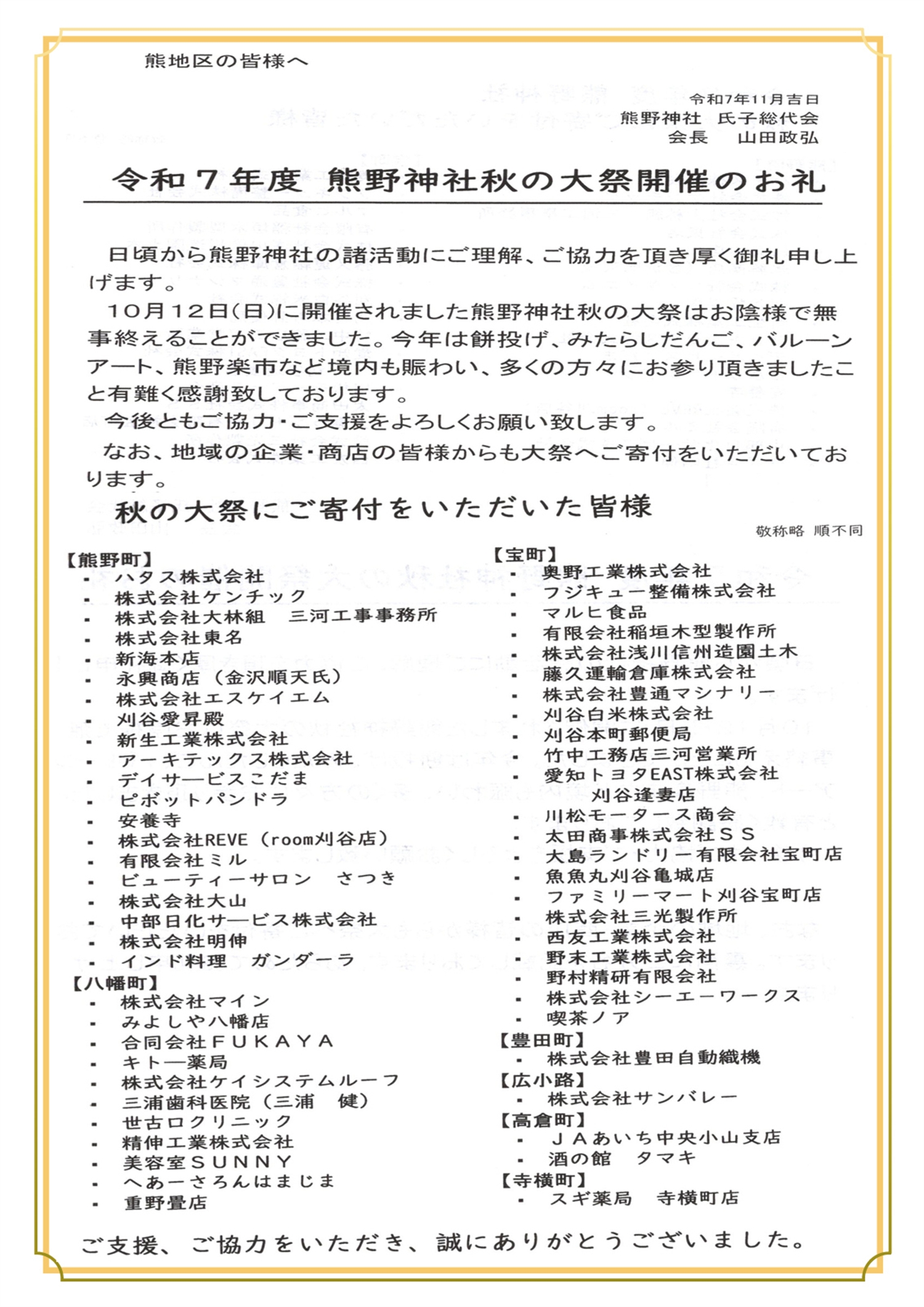 熊野神社 令和7年 秋の大祭開催のお礼・ご寄付をいただいた皆様のご紹介