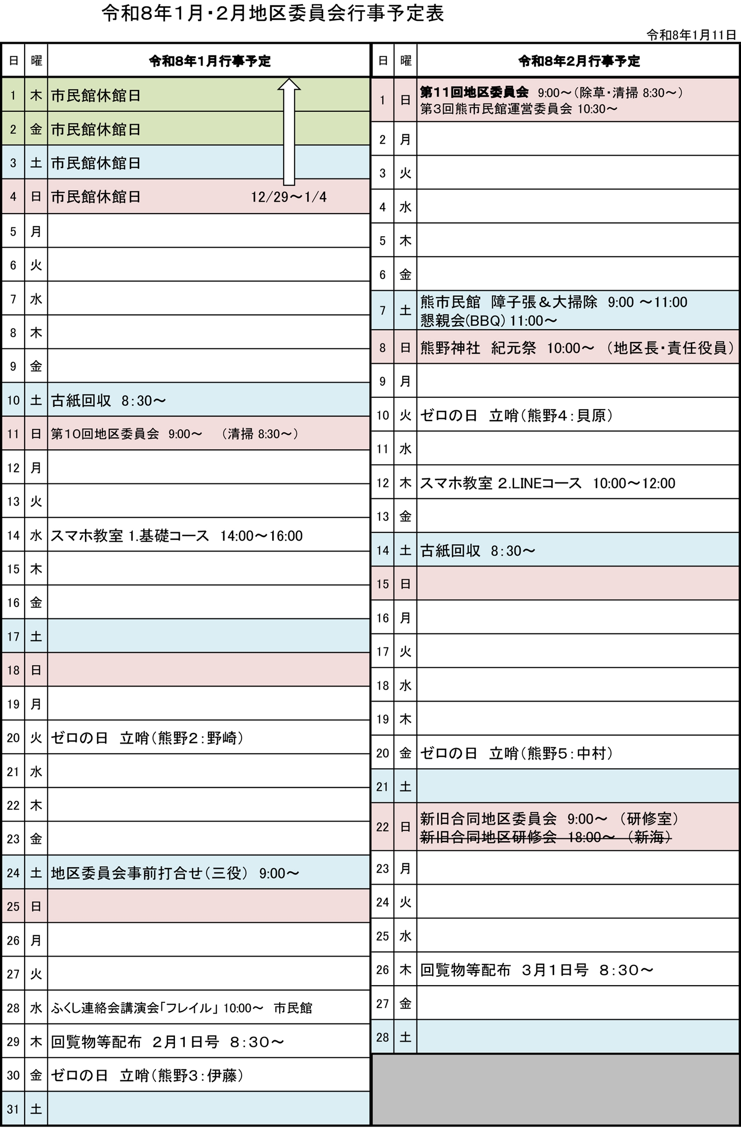 令和8年1月・2月 地区委員会 行事予定表